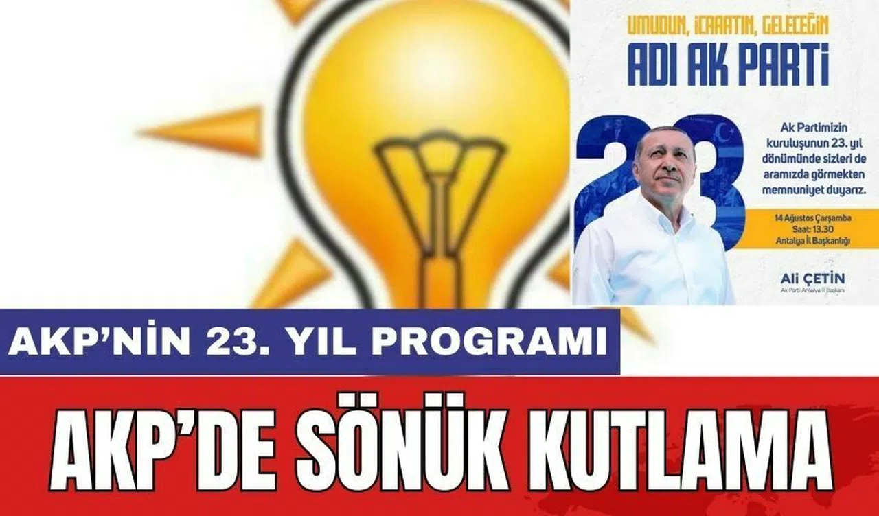 AKP’nin 23’üncü kuruluş yıldönümü programı Antalya’da İl Başkanlığı’nda 14 Ağustos 2024 günü saat 13.30’da gerçekleşecek. Yerel seçimlerde büyük bir yenilgi alan AKP’nin kutlama programının diğer yıllara göre daha sönük olacağı ileri sürülüyor.