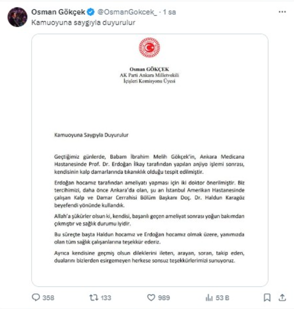 'Geçtiğimiz günlerde, Babam İbrahim Melih Gökçek'in, Ankara Medicana Hastanesinde Prof. Dr. Erdoğan İlkay tarafından yapılan anjiyo işlemi sonrası, kendisinin kalp damarlarında tıkanıklık olduğu tespit edilmiştir. Erdoğan hocamız tarafından ameliyatı yapması için iki doktor önerilmiştir. Biz tercihimizi, daha önce Ankara'da olan, şu an İstanbul Amerikan Hastanesinde çalışan Kalp ve Damar Cerrahisi Bölüm Başkanı Doç. Dr. Haldun Karagöz beyefendi yönünde kullandık. Allah'a şükürler olsun ki, kendisi, başarılı geçen ameliyat sonrası yoğun bakımdan çıkmıştır ve sağlık durumu iyidir. Bu süreçte başta Haldun hocamız ve Erdoğan hocamız olmak üzere, yanımızda olan tüm sağlık çalışanlarına teşekkür ederiz. Ayrıca kendisine geçmiş olsun dileklerini ileten, arayan, soran, takip eden, dualarını bizlerden esirgemeyen herkese sonsuz teşekkürlerimizi sunuyoruz.'