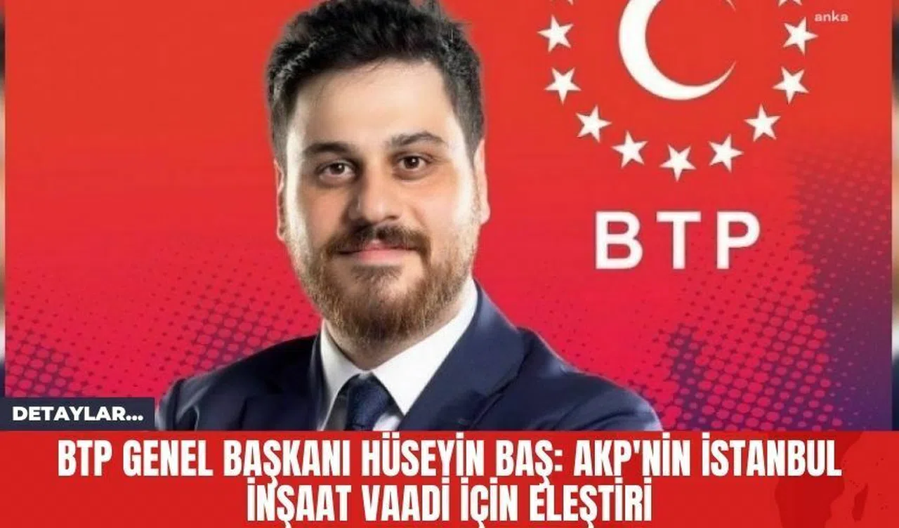 Bağımsız Türkiye Partisi (BTP) Genel Başkanı Hüseyin Baş, AKP'nin İstanbul Büyükşehir Belediye Başkan adayı Murat Kurum'un "Seçilirsek İstanbul’da 650 bin konut yapacağız" sözlerini sert bir dille eleştirdi. Baş, sosyal medya hesabından yaptığı paylaşımda, AKP'nin ve İstanbul İBB adayının vaatlerini sorguladı. Baş, "Seçilirsek İstanbul’da 650 bin konut yapacağız" diyen iktidar ve adayın, 12 yıllık süreçte 84 bin binayı dönüştürdüğünü belirterek, aynı hızda devam etmeleri durumunda vaatlerinin gerçekleşmesinin yıllar alacağını ifade etti. Baş, söz konusu açıklamaların hesap hatalarına veya yanlış bilgilere dayandığını iddia etti.