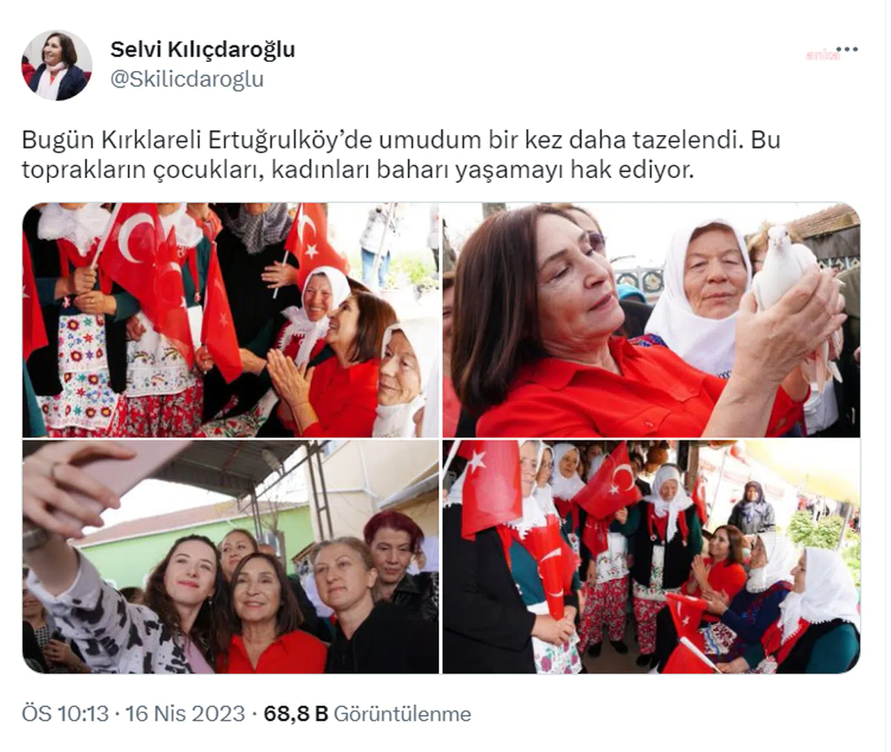 “Bugün Kırklareli Ertuğrulköy’de umudum bir kez daha tazelendi. Bu toprakların çocukları, kadınları baharı yaşamayı hak ediyor.”