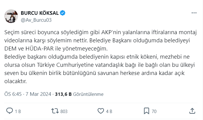 'Seçim süreci boyunca söylediğim gibi AKP’nin yalanlarına, iftiralarına ve montaj videolarına karşı söylemim nettir. Belediye Başkanı olduğumda belediyeyi DEM ve HÜDA-PAR ile yönetmeyeceğim. Belediye başkanı olduğumda belediyenin kapısı etnik kökeni, mezhebi ne olursa olsun Türkiye Cumhuriyeti'ne vatandaşlık bağı ile bağlı olan bu ülkeyi seven, bu ülkenin birlik bütünlüğünü savunan herkese ardına kadar açık olacaktır'