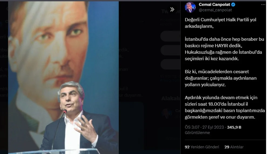 X (Twitter) üzerinden duyuru yapan Canpolat, "Değerli Cumhuriyet Halk Partili yol arkadaşlarım, İstanbul'da daha önce hep beraber bu baskıcı rejime HAYIR dedik, Hukuksuzluğa rağmen de İstanbul'da seçimleri iki kez kazandık.