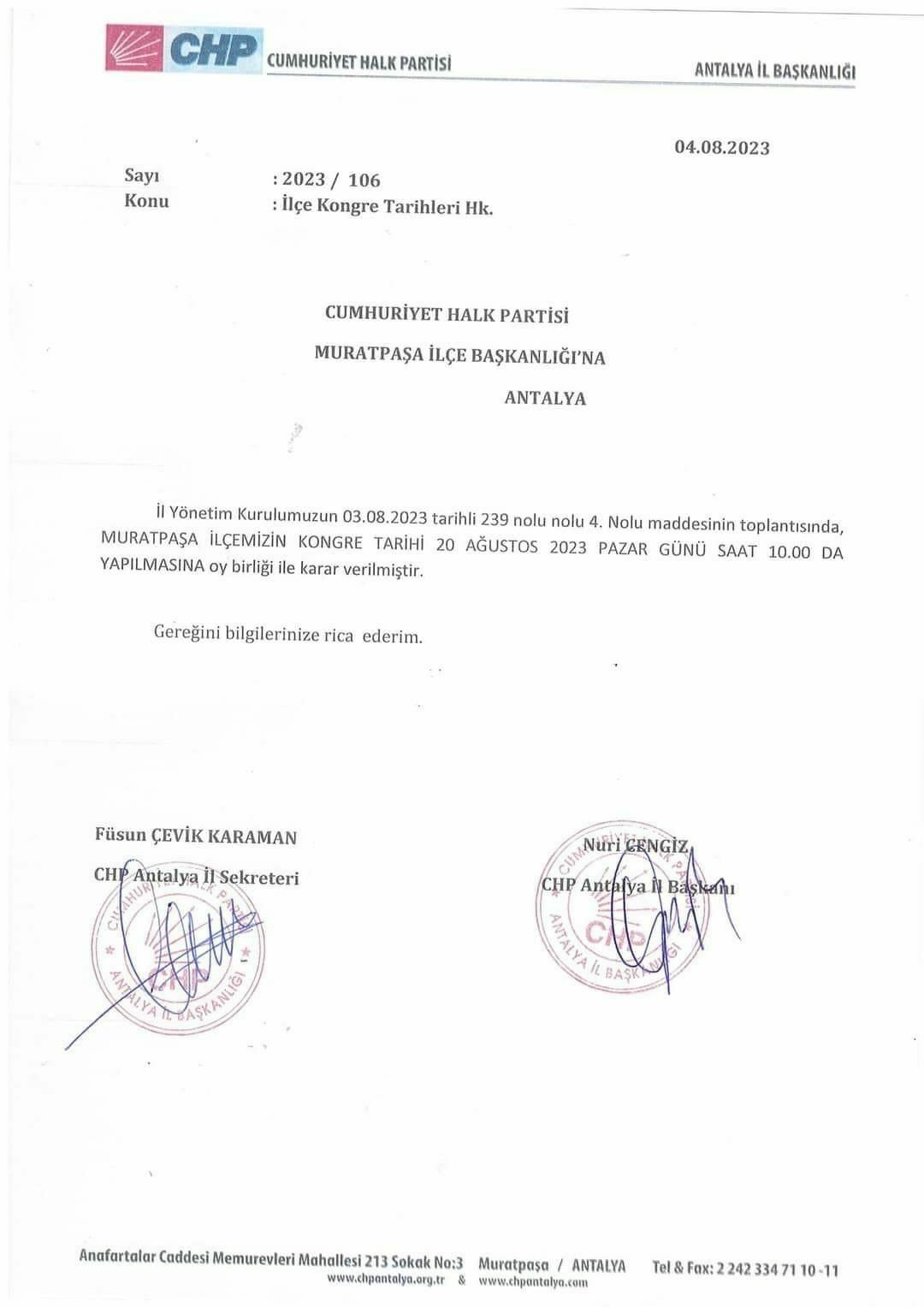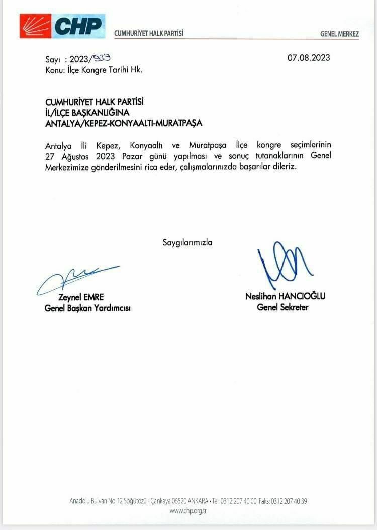 İl Örgütü’nün 4 Ağustos 2023 tarihli kararından sonra 7 Ağustos 2023 Pazartesi günü CHP Genel Sekreteri Neslihan Hancıoğlu ve Genel Başkan Yardımcısı Zeynel Emre imzalı başka bir karar alındı. Buna göre Kepez, Konyaaltı ve Muratpaşa için kongre günü ve saati 27 Ağustos Pazar saat 10.00 olarak belirlendi. Neden böyle bir karar alındığı bilinmezken, karar Antalya’da tepki çekti.