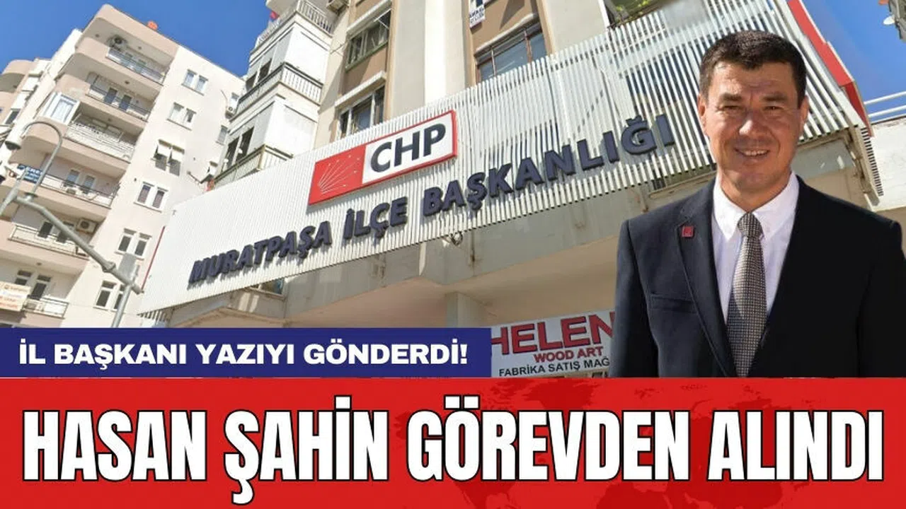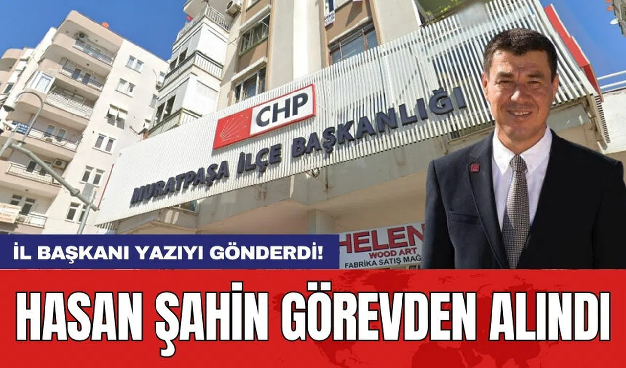 CHP Muratpaşa İlçe Başkanı Hasan Şahin, CHP Antalya İl Başkanlığı tarafından görevden alındı. Muratpaşa İlçe Sekreteri Can Okan Kıran'ın Şahin'in yerine görevlendirildiği öğrenilirken, görevden alma yazısının CHP Genel Merkezi'ne gönderildiği kaydedildi.
