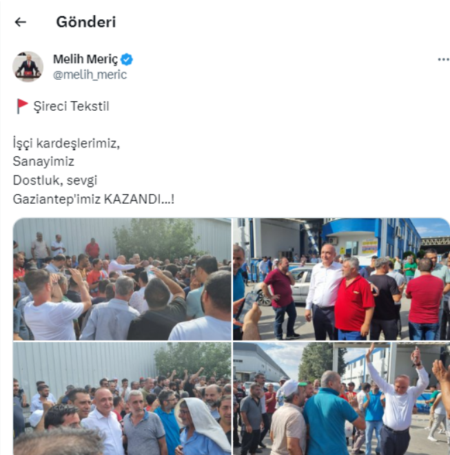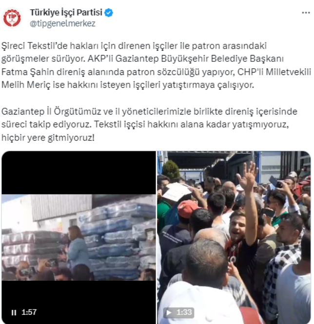 “Şireci Tekstil’de hakları için direnen işçiler ile patron arasındaki görüşmeler sürüyor. AKP’li Gaziantep Büyükşehir Belediye Başkanı Fatma Şahin direniş alanında patron sözcülüğü yapıyor, CHP’li Milletvekili Melih Meriç ise hakkını isteyen işçileri yatıştırmaya çalışıyor. Gaziantep il örgütümüz ve il yöneticilerimizle birlikte direniş içerisinde süreci takip ediyoruz. Tekstil işçisi hakkını alana kadar yatışmıyoruz, hiçbir yere gitmiyoruz!”