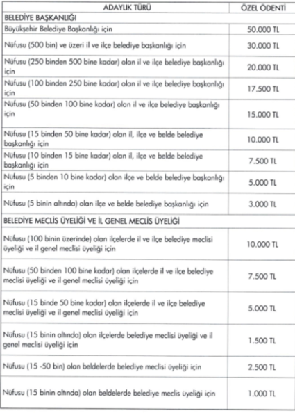Aday adaylığı için belirlenen ücret tarifesinde ise kadınlar ve gençler için indirim yapıldı. Engelli, gazi ve şehit yakınları ise ücret ödemeyecekler.