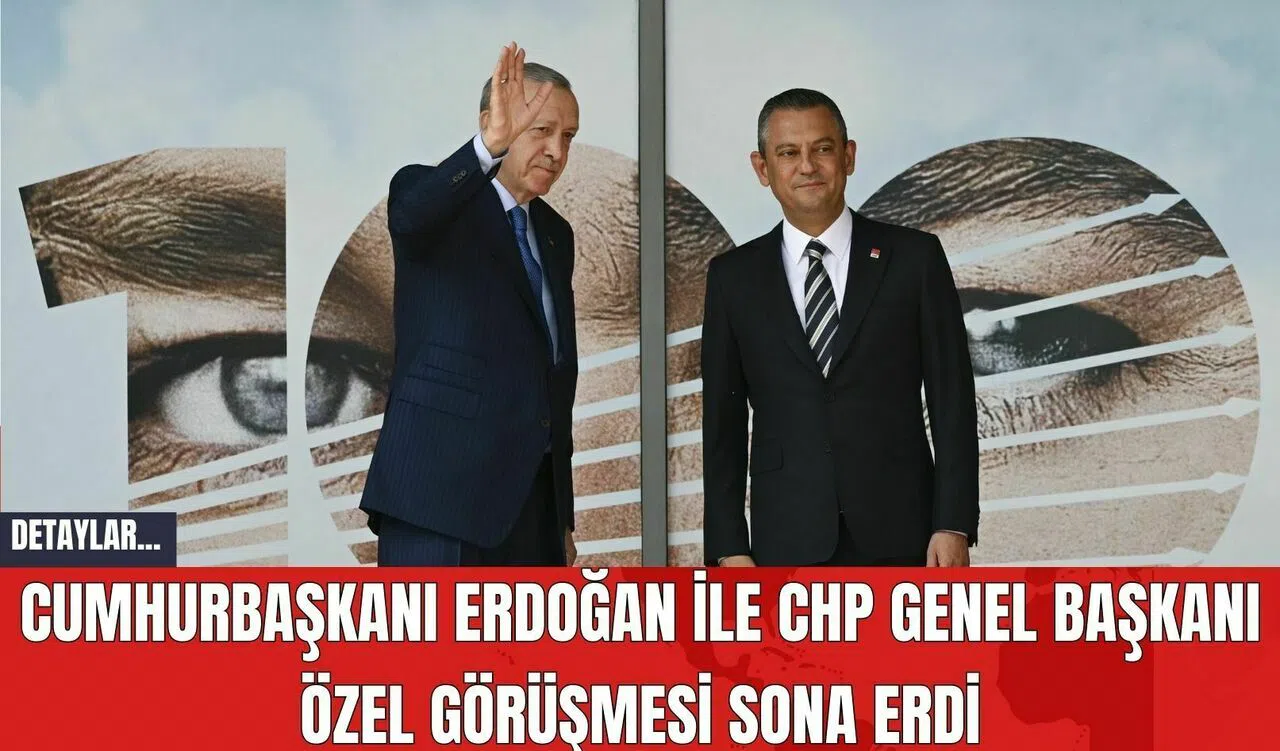Cumhurbaşkanı Recep Tayyip Erdoğan ile Cumhuriyet Halk Partisi (CHP) Genel Başkanı Özgür Özel görüşmesi sona erdi. Cumhurbaşkanı Recep Tayyip Erdoğan, CHP Genel Başkanı Özgür Özel ile Cumhuriyet Halk Partisi başkanlık makamında görüştü. Görüşme yaklaşık 1 saat 30 dakika sürdü. Özel, Cumhurbaşkanı Erdoğan'a aracına kadar eşlik etti. Cumhurbaşkanı Erdoğan'a AK Parti Genel Başkanvekili Mustafa Elitaş, CHP Genel Başkanı Özgür Özel'e ise CHP İstanbul Milletvekili ve eski büyükelçi Namık Tan eşlik etti. Erdoğan, Özgür Özel'i 2 Mayıs'ta AK Parti Genel Merkezi'nde kabul etmişti.