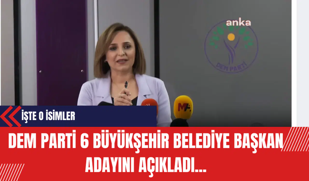 DEM Parti Sözcüsü Ayşegül Doğan, 6 büyükşehirdeki belediye başkan adaylarını basın toplantısıyla açıkladı. DEM Parti'nin Adana Büyükşehir Belediyesi Eş Başkan adayları Şehriban Defişat ve Mahfuz Güleryüz, Aydın Büyükşehir Belediyesi Eş Başkan adayları Suzan Koç ve Raif Kanat, Hatay Büyükşehir Belediyesi Eş Başkan adayları Perihan Pakize Sinemillioğlu, İzmir'deki adayları Türkan Aslan ve Akın Birdal, Muğla Büyükşehir Belediyesi Eş Başkan adayları Candan Süsoy ve Yusuf Uludağ, Tekirdağ Büyükşehir Belediyesi Eş Başkan adayları Müselma Keskintürk ve Sadi Özdemir oldu.