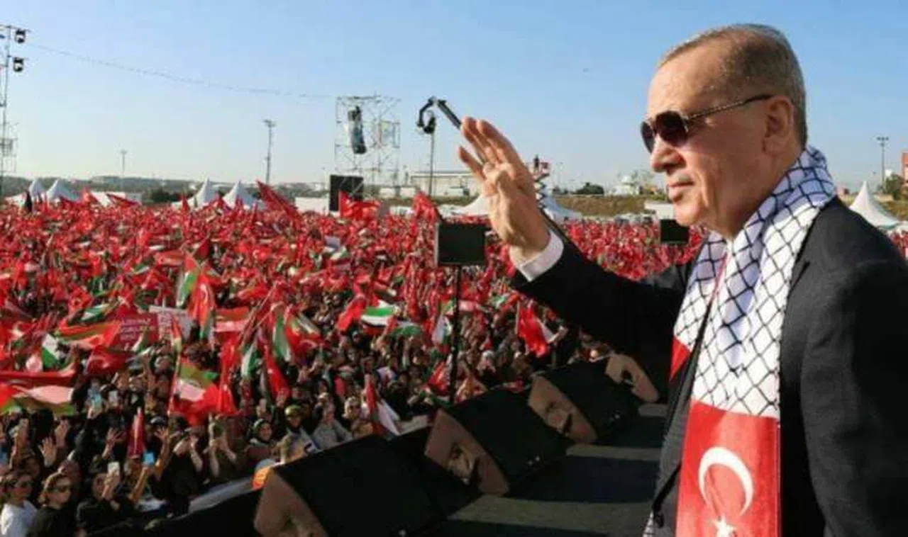 AKP’nin 29 Ekim Cumhuriyet Bayramı’ndan bir gün önce düzenlediği "Büyük Filistin Mitingi"nde konuşan Erdoğan, Gezi Direnişi’ne saldırdı. Mitinge Cumhur İttifakı’nın diğer ortağı Yeniden Refah Partisi lideri Fatih Erbakan katılmadı. Erbakan’ın neden gelmediği konusunda bir açıklama yapmadığı belirtildi. Erdoğan, mitingde MHP lideri Bahçeli, BBP lideri Destici, HÜDA PAR lideri Yapıcıoğlu, DSP lideri Aksakal, TBMM Başkanı Kurtulmuş, Cumhurbaşkanı Yardımcısı Yılmaz, KKTC Cumhurbaşkanı Tatar, Filistin Büyükelçisi Mustafa ve eşi Emine Erdoğan ile birlikte sahneye çıktı. Erdoğan, konuşmasına başlamadan önce mitinge katılanlara teşekkür etti ve Kuran tilaveti dinledi. Erdoğan’ın konuşmasından bazı başlıklar şunlardır: