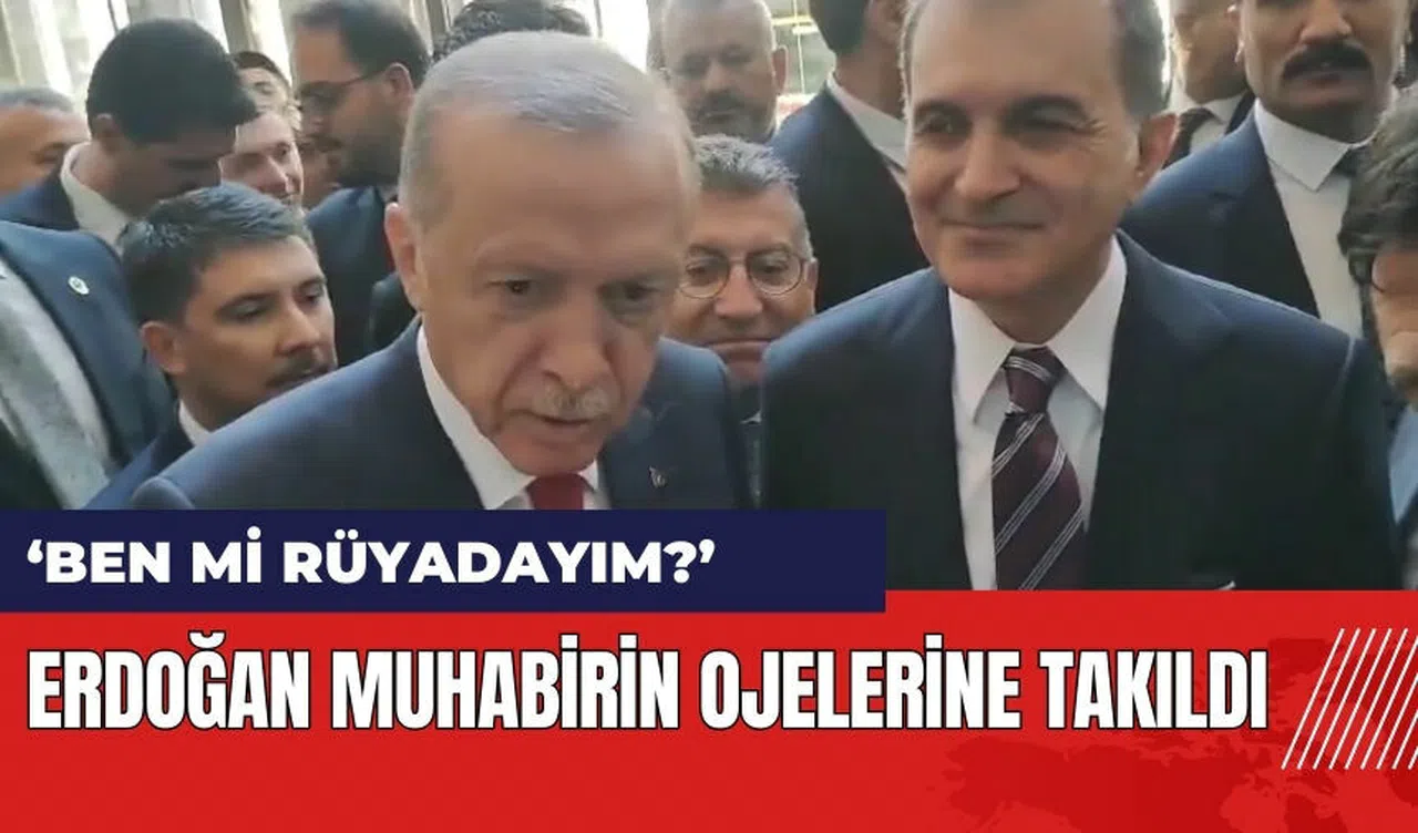 Gazeteci Rüya Erkuş, Erdoğan'a mikrofon uzatarak, 'Kısa bir sorumuz olacaktı eğer...' dedi. Ancak Cumhurbaşkanı Erdoğan, Erkuş'un farklı renklerdeki ojelerini fark ederek, 'Bu ojeler ne? Ojelerin modeli acayip... Ben mi rüyadayım?' şeklinde esprili bir yorum yaptı.