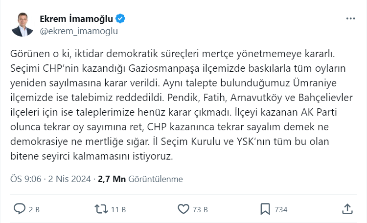 İstanbul Büyükşehir Belediye Başkanı Ekrem İmamoğlu, aldıkları karara tepki gösterdi. İmamoğlu, 'Görünen o ki, iktidar demokratik süreçleri mertçe yönetmemeye kararlı. Seçimi CHP’nin kazandığı Gaziosmanpaşa ilçemizde baskılarla tüm oyların yeniden sayılmasına karar verildi. Aynı talepte bulunduğumuz Ümraniye ilçemizde ise talebimiz reddedildi. Pendik, Fatih, Arnavutköy ve Bahçelievler ilçeleri için ise taleplerimize henüz karar çıkmadı. İlçeyi kazanan AK Parti olunca tekrar oy sayımına ret, CHP kazanınca tekrar sayalım demek ne demokrasiye ne mertliğe sığar. İl Seçim Kurulu ve YSK’nın tüm bu olan bitene seyirci kalmamasını istiyoruz' ifadelerine yer verdi.