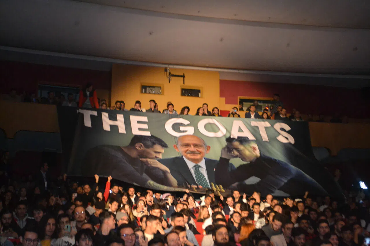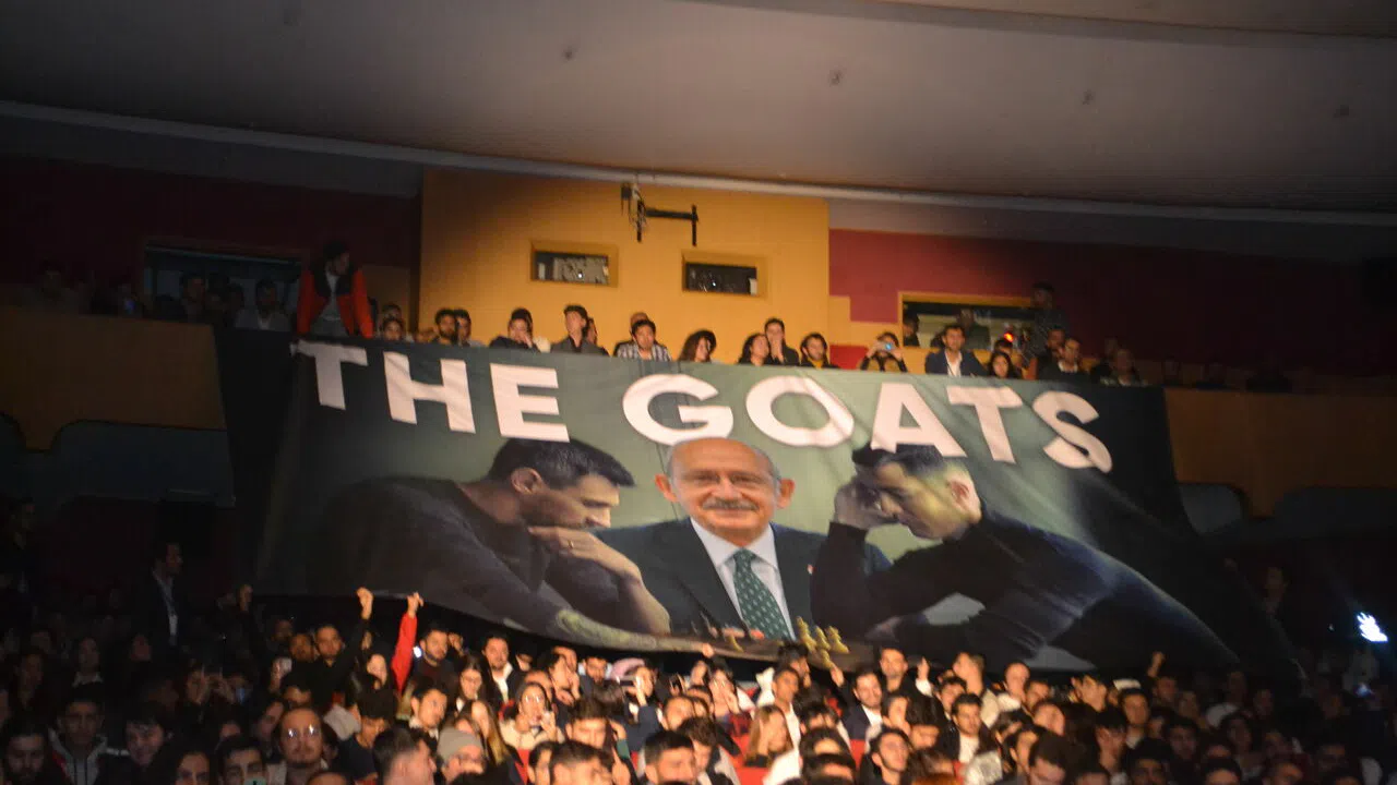 Gençler, Lionel Messi ve Cristiano Ronaldo’nun dünya kupası öncesi verdiği meşhur poza Kılıçdaroğlu’nu da ekleyerek büyük bir jest yaptı. Açılan pankartta, G.O.A.T. ‘Greatest Of All Time'ın’ yani ‘Tüm Zamanların En İyisi’ kelimesi dikkat çekti.