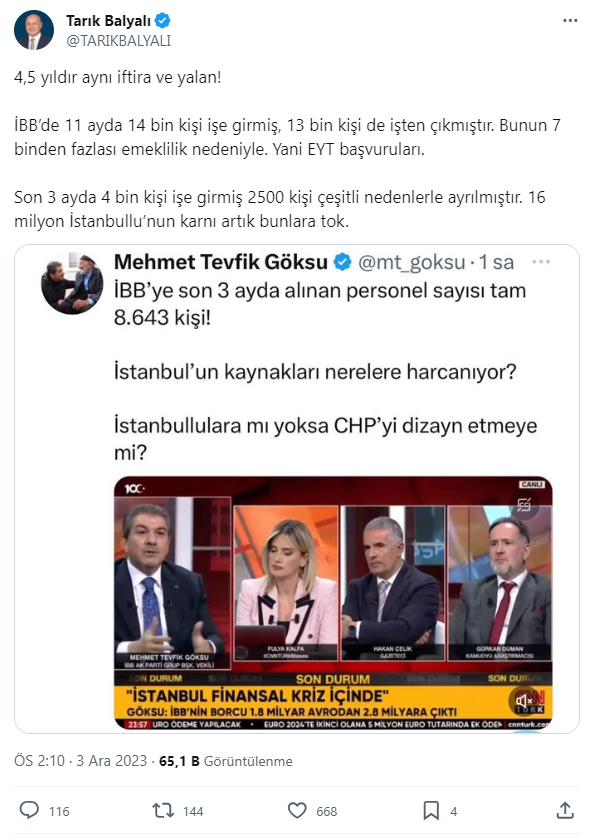 '4,5 yıldır aynı iftira ve yalan! İBB’de 11 ayda 14 bin kişi işe girmiş, 13 bin kişi de işten çıkmıştır. Bunun 7 binden fazlası emeklilik nedeniyle. Yani EYT başvuruları. Son 3 ayda 4 bin kişi işe girmiş 2500 kişi çeşitli nedenlerle ayrılmıştır. 16 milyon İstanbullu’nun karnı artık bunlara tok' diye vurguladı.