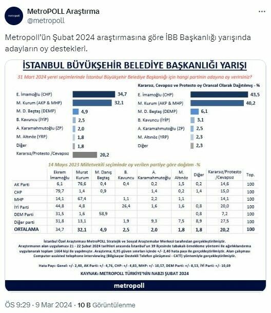 MetroPOLL Araştırma Şirketi, son yapılan ankete dair önemli verileri sosyal medya hesapları üzerinden paylaştı. 21-22 Şubat tarihleri arasında 39 ilçede gerçekleştirilen ankete göre, 1664 kişiyle yapılan görüşmelerin hata payı +/- 2,40 puan olarak belirlendi.