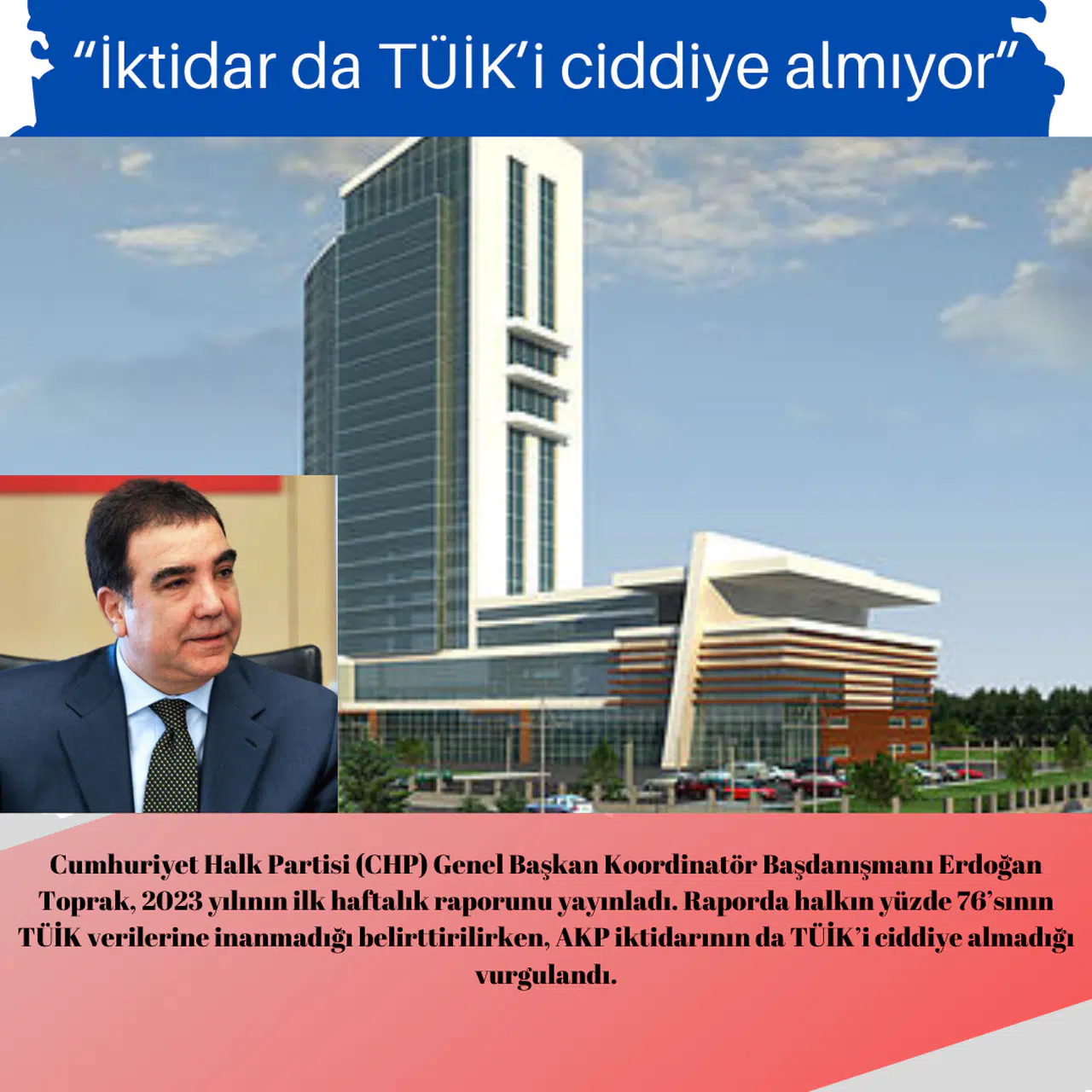 İstanbul Milletvekili Erdoğan Toprak, “Yapılan anketlerde TÜİK’in rakamlarına güvenenlerin oranı sadece yüzde 24 olurken, güvenilmez bulanların oranı iktidar ittifakının seçmenleri de dahil yüzde 76! AKP’ye oy verenlerin yüzde 33’ü, MHP’ye oy verenlerin yüzde 36,2’si TÜİK’e inanırken, bu iki partiye oy verenlerden TÜİK’e inanmayanların oranı sırasıyla yüzde 67 ve yüzde 64!” diyerek AKP ve MHP’yi destekleyen vatandaşın büyük kısmının TÜİK’in açıkladığı verilere inanmadığını belirtti.