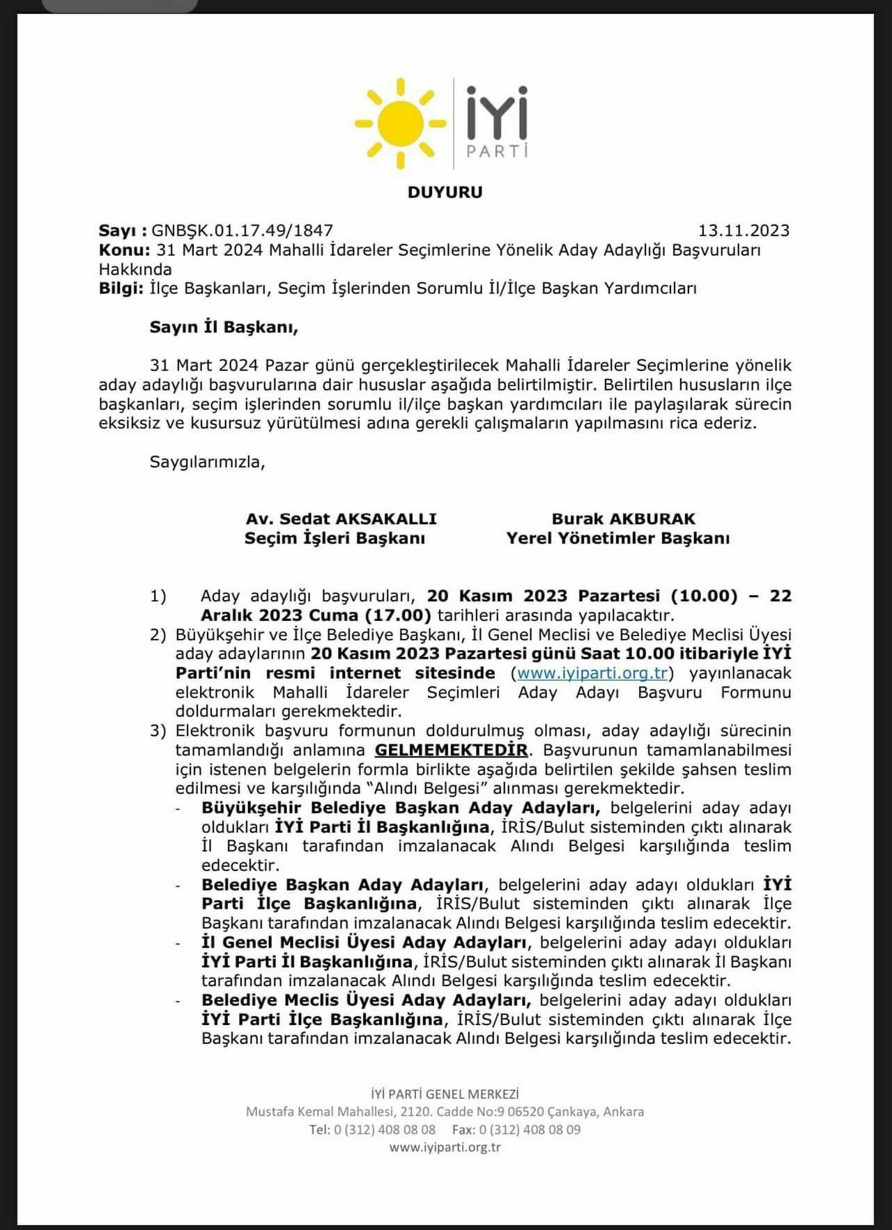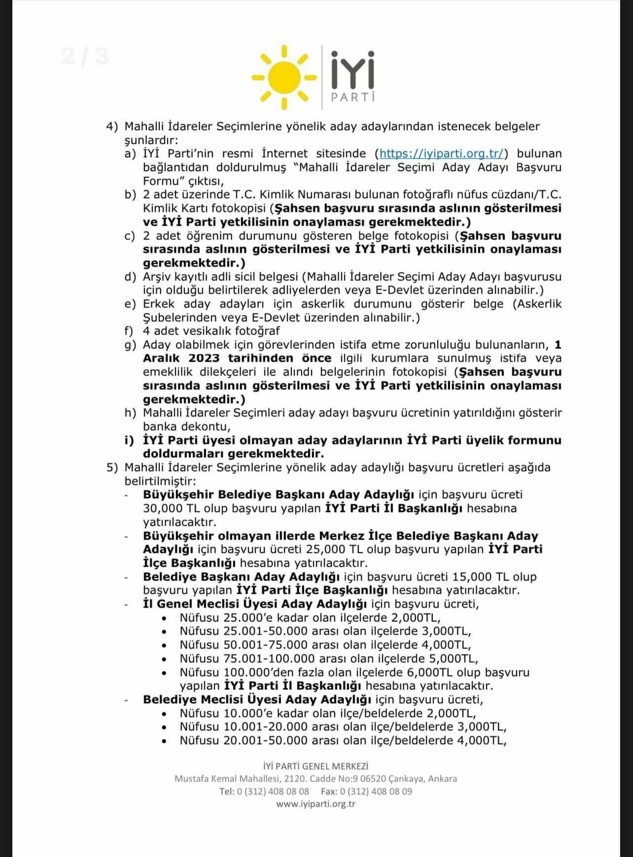 Büyükşehir ve İlçe Belediye Başkanı, İl Genel Meclisi ve Belediye Meclisi Üyesi aday adaylarının 20 Kasım 2023 Pazartesi günü saat 10.00 itibariyle partinin resmî internet sitesinde (www.iyiparti.org.tr) yayınlanacak elektronik Mahallî İdareler Seçimleri Aday Adayı Başvuru Formu'nu doldurmaları istenen açıklamada elektronik başvuru formunun doldurulmuş olmasının yetmediği, başvurunun tamamlanabilmesi için istenen belgelerin formla birlikte teslim edilmesi ve karşılığında “Alındı Belgesi” alınması gerektiği ifade edildi.