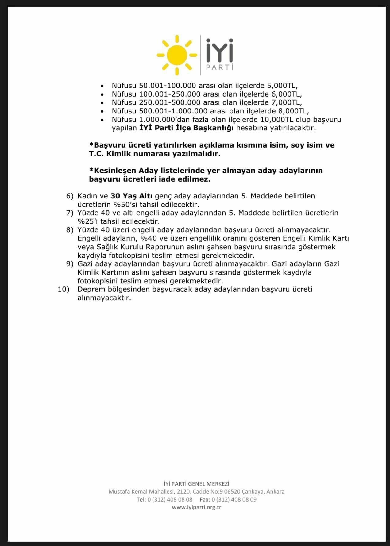 Başvurularda kadınlar ve gençlerden yüzde 50, yüzde 40'a kadar engellilerden yüzde 25 başvuru ücreti alınacak. İYİ Parti'den yapılan açıklamaya göre yüzde 40 üstü engellilerden, gazilerden ve deprem bölgesinden aday olacaklardan başvuru ücreti alınmayacak. Seçim İşleri Başkanı Sedat Aksakallı ve Yerel Yönetimler Başkanı Burak Akburak imzalı genelgeye göre adaylık koşulları tek tek sıralandı.
