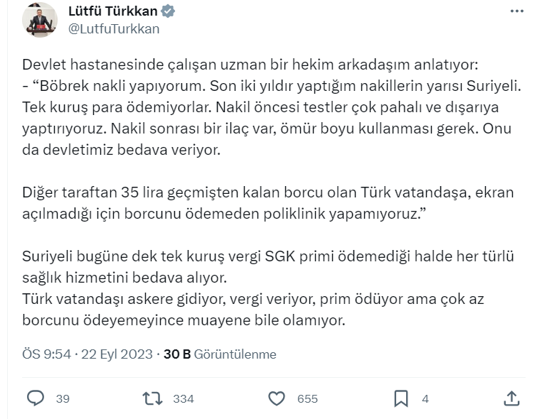 İYİ Partili Lütfü Türkan doktor arkadaşıyla yapmış olduğu sohbeti sosyal medyasında açıkladı.