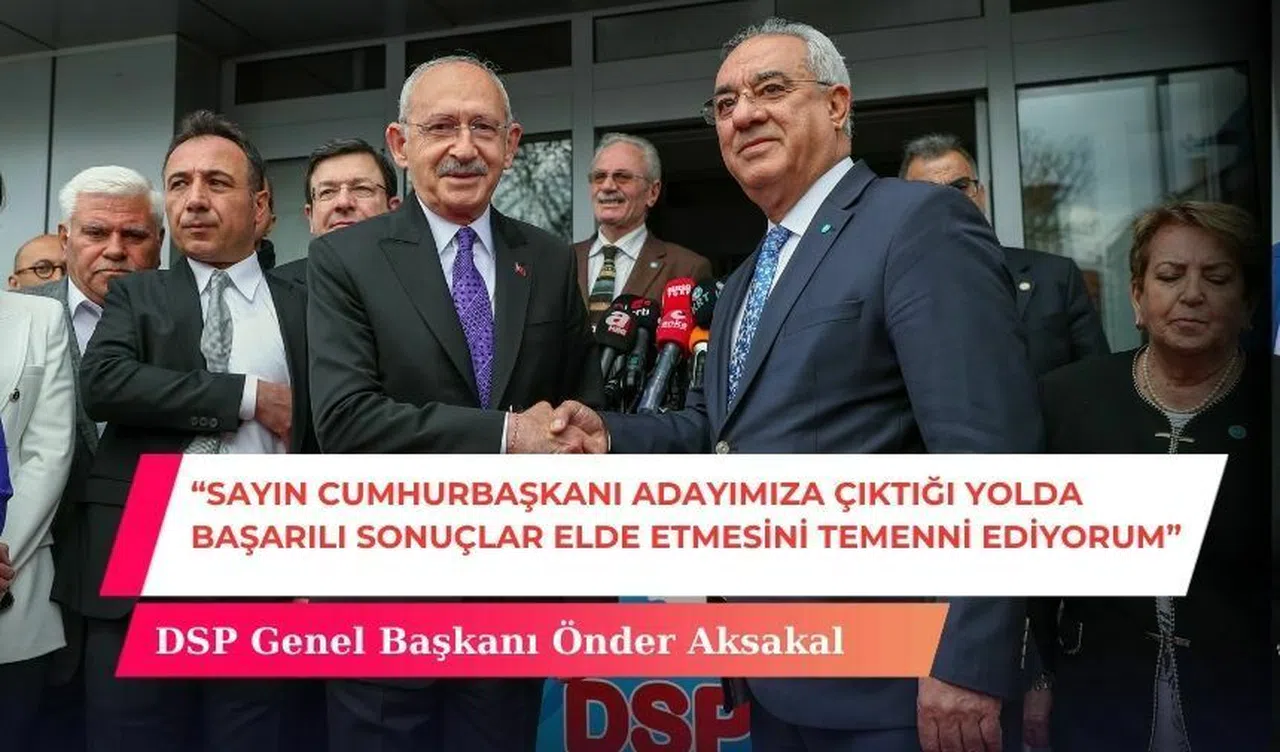 Aksakal, ziyaretin ardından; “14 Mayıs seçimlerini bir önceki seçimlerden ayıran en önemli özellik küresel emperyalist yapılarla, kadim Türkiye devletinin arasında bir seçim olduğudur. Cumhuriyetimizin yüzyıllık geçmişiyle hesaplaşma hayalleri kuranlara DSP elbette ki Türk milletinin bu hassasiyetiyle gerekli karşılığı vermiştir. Ben de sayın CHP Genel Başkanımıza, Sayın Cumhurbaşkanı adayımıza çıktığı yolda, başarılı sonuçlar elde etmesini temenni ediyorum” dedi. Kılıçdaroğlu, “Göreceksiniz 15 Mayıs’ta yeni bir Türkiye’ye uyanacağız hep beraber, baharı göreceğiz, güzelliği göreceğiz, kucaklaşmayı göreceğiz, huzuru göreceğiz, farklı düşüncelere saygıyı göreceğiz, siyasal partiler arasındaki dayanışmayı ve karşılıklı söylenen önerilerin ne kadar sağlıklı bir ortamda dinlendiğini göreceğiz” dedi.