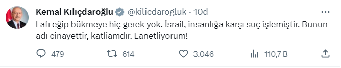 Gazze'deki hastaneyi bombalayan İsrail'i CHP Lideri Kılıçdaroğlu sosyal medyadan yaptığı paylaşımla kınadı.