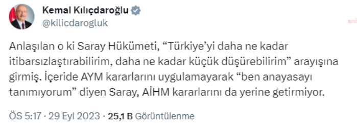 CHP Genel Başkanı Kemal Kılıçdaroğlu, Anayasa Mahkemesi ve Avrupa İnsan Hakları Mahkemesi kararlarının uygulanmamasına ilişkin sosyal medya hesabı X'ten (Twitter) açıklama yaptı. Kılıçdaroğlu’nun mesajı şöyle: