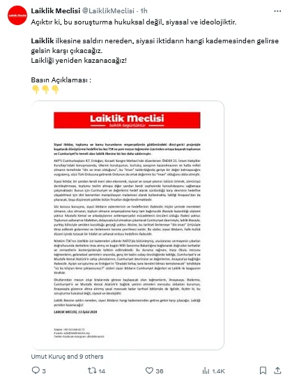 Laiklik Meclisi, açıklamasında Cumhuriyet ve değerlerinin hedef alınarak, karşı devrimin ilerletildiği ve laikliğin Anayasa’dan çıkarılmaya çalışıldığı görüşünü dile getirdi. Açıklamada şu ifadelere yer verildi: "Siyasi iktidar, ekonomik, siyasal ve sosyal yıkımın üstünü örtmek, toplumu teslim almak ve kendi cephesinde konsolidasyonu sağlamak için laiklik karşıtı hamlelerini sürdürmektedir. Dini kavramlar, bu süreçte manipülasyon malzemesi olarak kullanılmakta ve Cumhuriyet değerleri sürekli olarak hedef alınmaktadır."