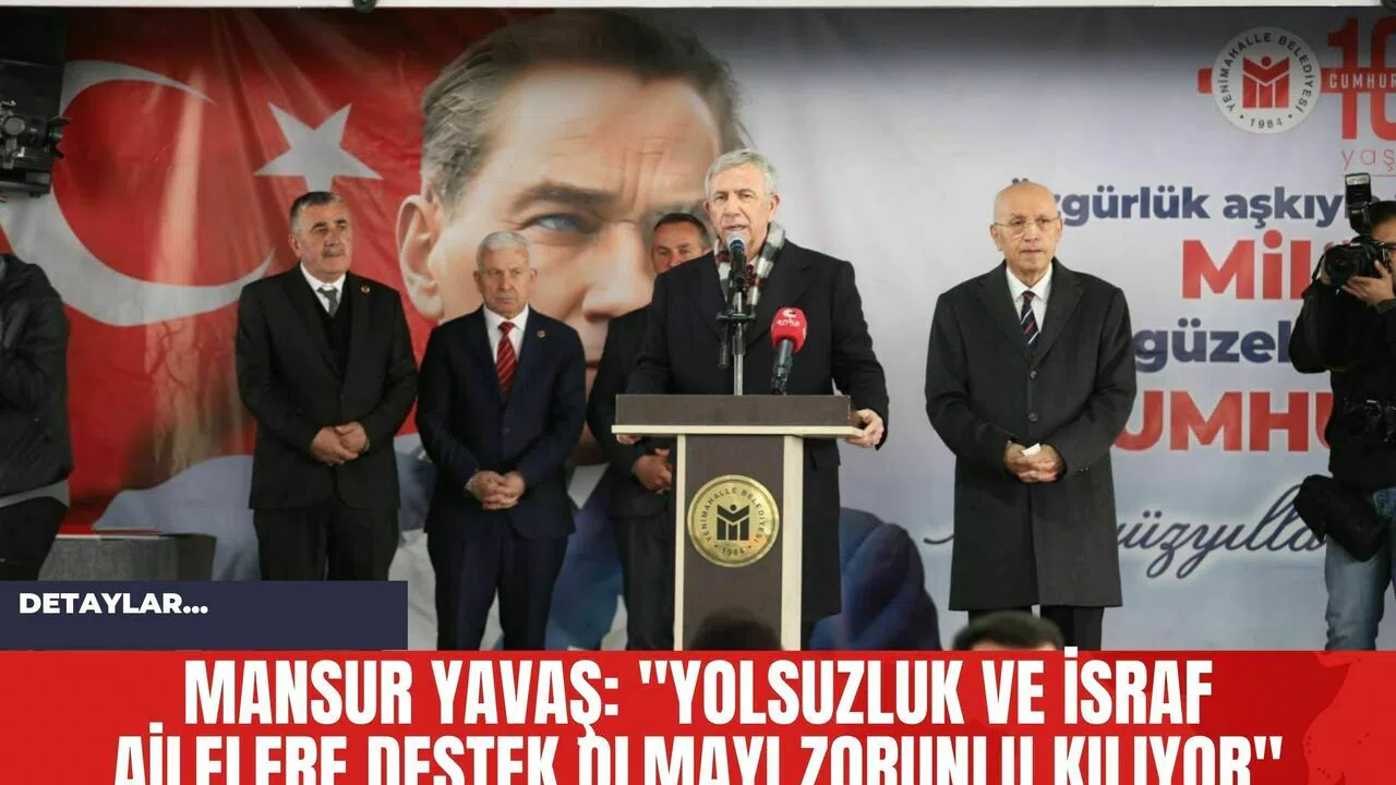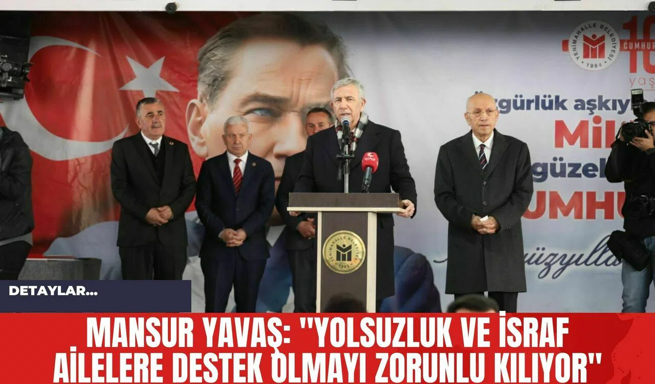 Ankara Büyükşehir Belediye (ABB) Başkanı Mansur Yavaş, Şentepe Pazar Yeri ve Sosyal Tesisleri'nin açılışında yaptığı konuşmada, kamu yöneticilerinin yolsuzluk ve israfının aileleri destek almaya zorladığını belirtti. Yavaş, belediye başkanlarının görevlerinin insanlara hizmet etmek olduğunu vurguladı ve bu hizmetlerin insan odaklı olması gerektiğini savundu.