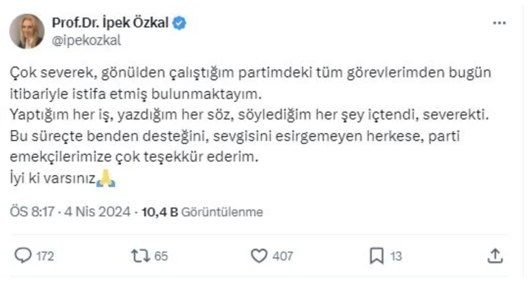 İpek Özkal, resmi sosyal medya hesabından yaptığı açıklamada, partideki tüm görevlerinden bugün itibarıyla istifa ettiğini kamuoyuna duyurdu.