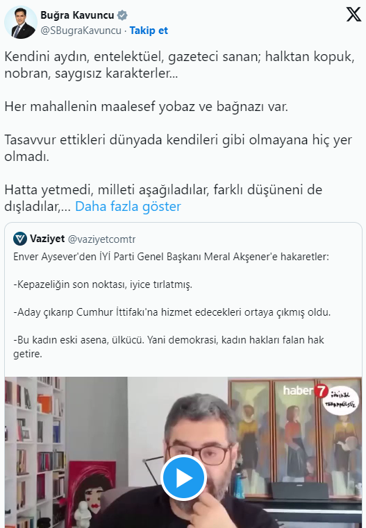 İYİ Parti İstanbul milletvekili Buğra Kavuncu, Genel Başkanı Meral Akşener hakkındaki ifadeleri nedeniyle gazeteci Enver Aysever’e sert tepki gösterdi.