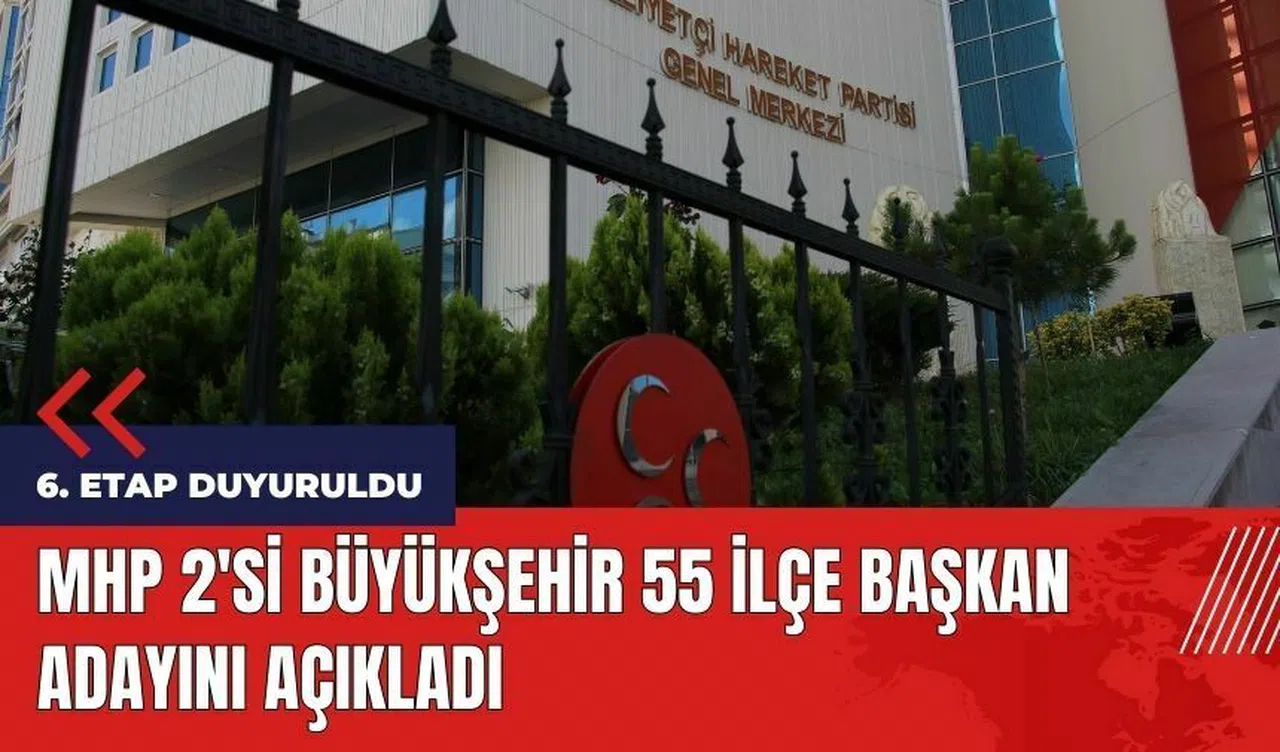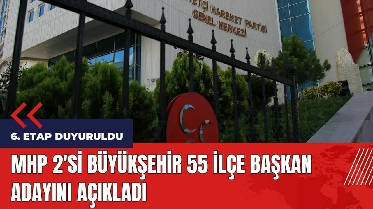 31 Mart 2024 Mahalli İdareler Seçimleri için 6. etap adaylıkları kesinleşen Milliyetçi Hareket Partisi (MHP), 2 Büyükşehir İlçe, 53 İlçe Belediye Başkan Adayı olmak üzere toplam 55 adayın isimlerini kamuoyu ile paylaştı.