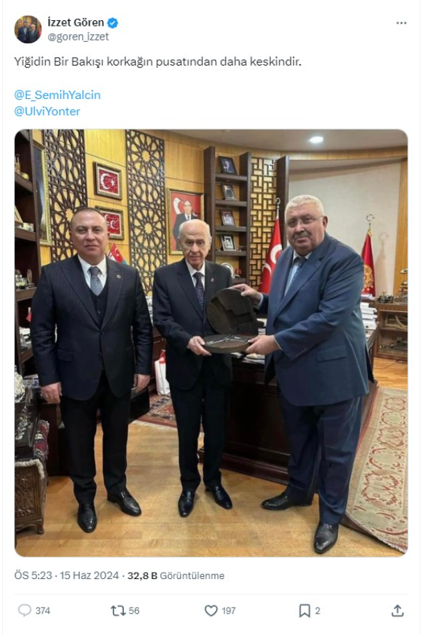 MHP MYK üyesi İzzet Gören, Bahçeli'nin de yer aldığı silahlı fotoğrafı paylaşarak, 'Yiğidin bir bakışı korkağın pusatından daha keskindir' ifadelerini kullandı.
