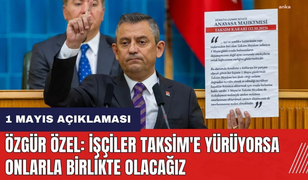 Cumhuriyet Halk Partisi (CHP) Genel Başkanı Özgür Özel, parti grup toplantısında yaptığı konuşmada, 1 Mayıs İşçi Bayramı'nı vurgulayarak, partisinin 55 ilde ve 120 merkezde işçilerin yanında olacağını açıkladı. Özel, 1 Mayıs kutlamalarında HAK-İŞ ve TÜRK-İŞ'in etkinliklerine katılacaklarını belirtirken, işçilerin Anayasa'ya uygun şekilde Taksim'e yürüyüşlerine destek vereceklerini ifade etti.