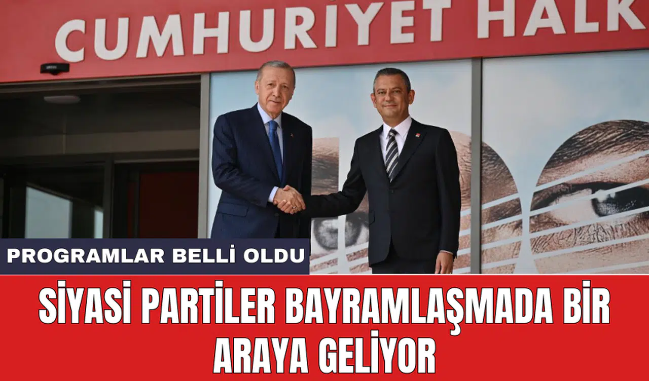 AKP'nin bayramlaşma programı saat 09.30'da CHP'yi ziyaret ederek başlayacak. Daha sonra MHP, HÜDA PAR, Yeniden Refah Partisi, BBP, DSP, İYİ Parti ve Vatan Partisi ile devam edecek. Birinci ziyaret heyeti saat 09.30'da CHP'yi ziyaret edecek, ardından HÜDA PAR, BBP ve İYİ Parti ziyaret edilecek. İkinci ziyaret heyeti ise 09.50'de MHP, ardından Yeniden Refah Partisi, DSP ve Vatan Partisi'ni ziyaret edecek.