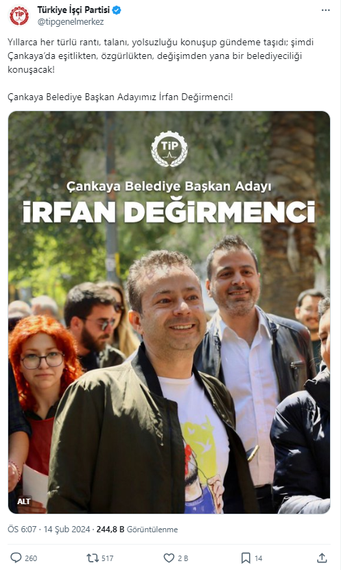 Türkiye İşçi Partisi (TİP), sosyal medya hesabından yaptığı duyuruyla İrfan Değirmenci'nin Çankaya Belediye Başkanı adayı olduğunu açıkladı. Açıklamada, 'Yıllarca her türlü rantı, talanı, yolsuzluğu konuşup gündeme taşıdı; şimdi Çankaya’da eşitlikten, özgürlükten, değişimden yana bir belediyeciliği konuşacak! Çankaya Belediye Başkan Adayımız İrfan Değirmenci!' ifadelerine yer verdi.
