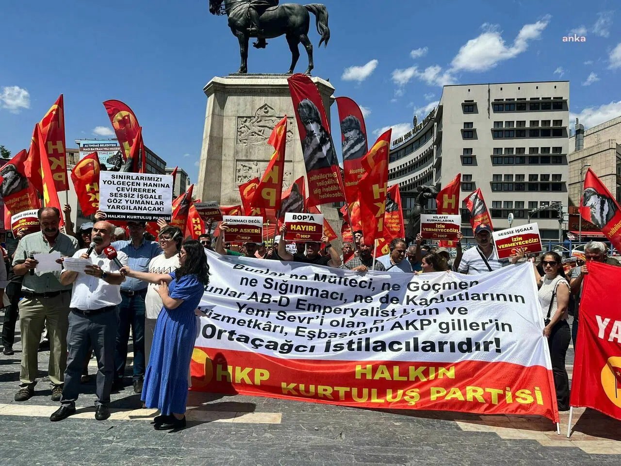HKP yöneticileri ve üyeleri iktidarın göçmen politikalarına ilişkin bugün Ankara Ulus'ta protesto eylemi düzenledi. "ABD emperyalist haydudunun BOP'una, vatan topraklarının işgaline, AKP'gillerin hilafet kurma planına izin vermeyeceğiz", "Yeni Sevr'e karşı yaşasın ikinci kurtuluş savaşımız", "Sınırlarımızı yol geçen hanına çevirerek sessiz işgale göz yumanlar yargılanacak" pankartları arkasında bir araya gelen parti üyeleri, "Sığınmacı değil, hilafete asker", "Göçmen değil istilacı", "Emperyalistler işbirlikçiler geldikleri gibi gidecekler" sloganları attı.