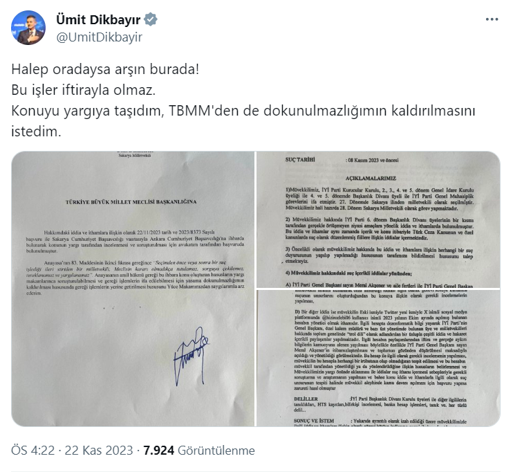 Dilekçe içeriğinde, 'Hakkımdaki iddia ve ithamlara ilişkin olarak 22/11/2023 tarih ve 2023/8373 Sayılı başvuru ile Sakarya Cumhuriyet Başsavcılığı vasıtasıyla Ankara Cumhuriyet Başsavcılığı'na ihbarda bulunarak konunun yargı tarafından incelenmesi ve soruşturulması için avukatım tarafından başvuruda bulunulmuştur' ifade edildi.