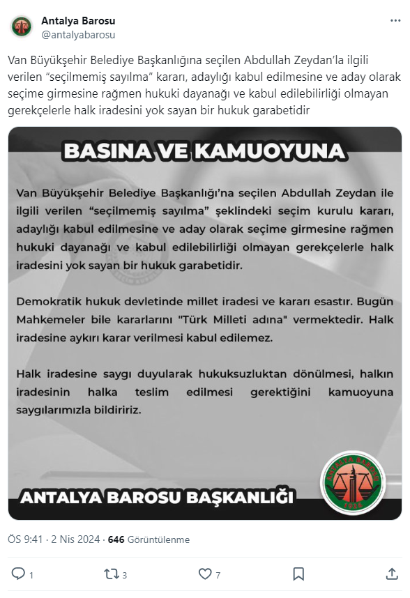 Kararın ardından Antalya Barosu Başkanlığı, verilen karara sert tepki gösterdi. Antalya Barosu, sosyal medya hesapları üzerinden yaptığı açıklamada, 'Van Büyükşehir Belediye Başkanlığına seçilen Abdullah Zeydan’la ilgili verilen 'seçilmemiş sayılma' kararı, adaylığı kabul edilmesine ve aday olarak seçime girmesine rağmen hukuki dayanağı ve kabul edilebilirliği olmayan gerekçelerle halk iradesini yok sayan bir hukuk garabetidir' ifadelerini kullandı.