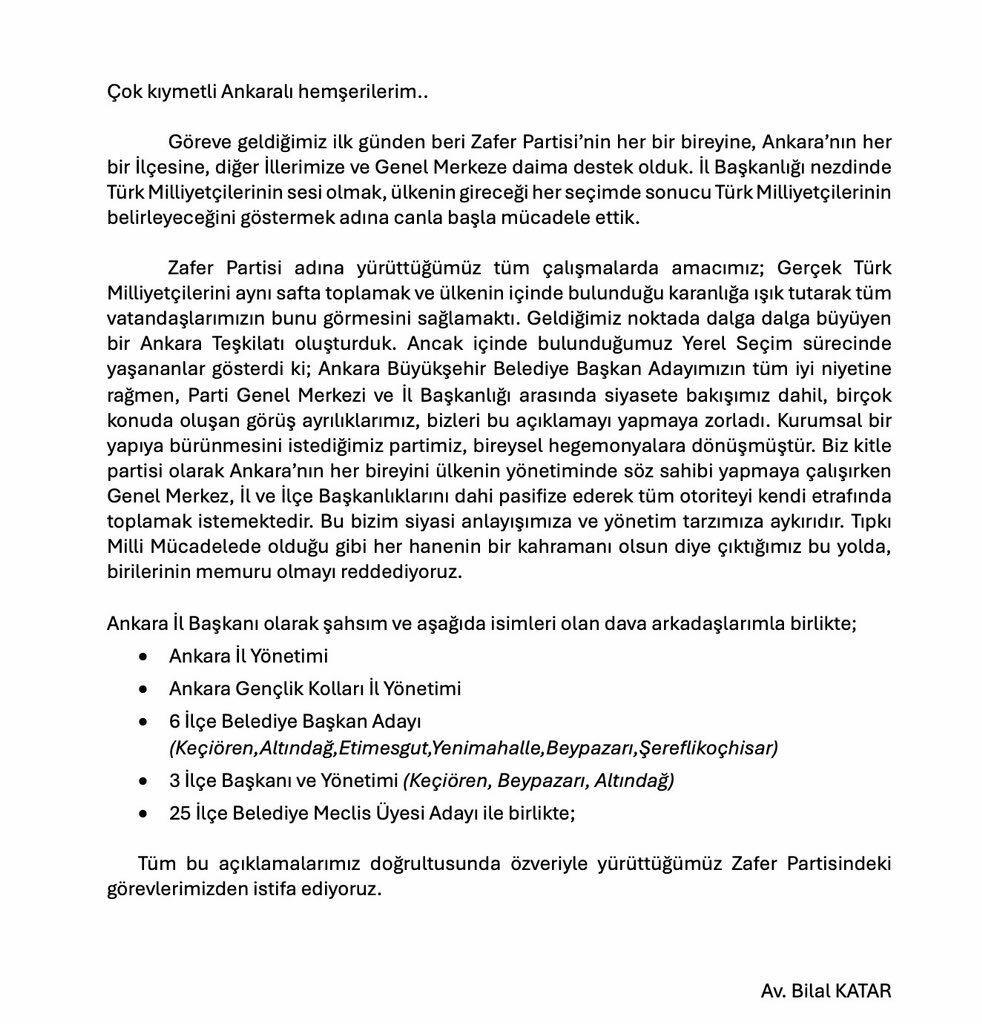 Açıklama Zafer Partisi Ankara İl Başkanı Bilal Katar'dan geldi. Sosyal medya hesabından yapılan açıklamada şu ifadeler kullanıldı;
