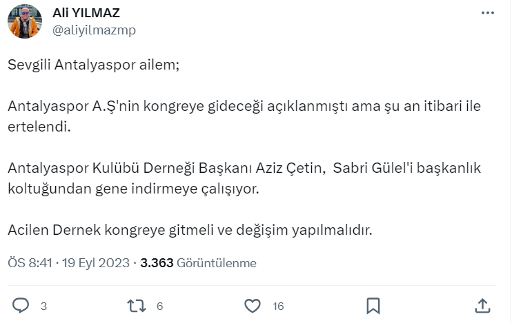 Antalyaspor'un eski Başkanı Ali Yılmaz sosyal medyada yaptığı paylaşımla büyük iddialarda bulundu.