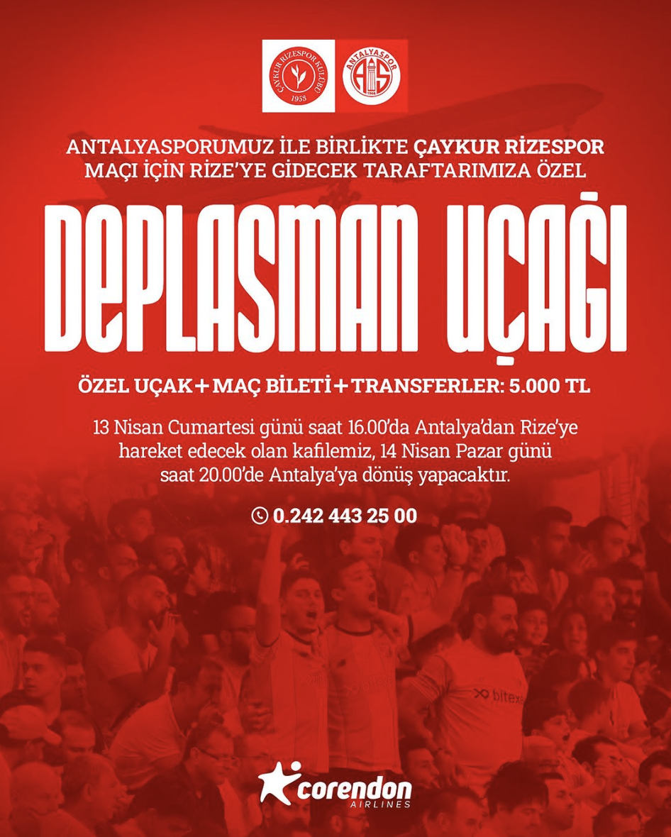 Antalyaspor, Çaykur Rizespor ile yapacağı deplasman maçı için özel bir uçak kaldıracağını duyurdu.