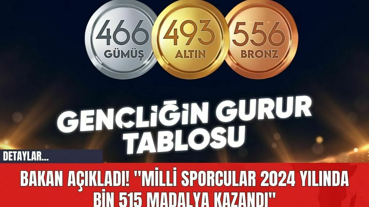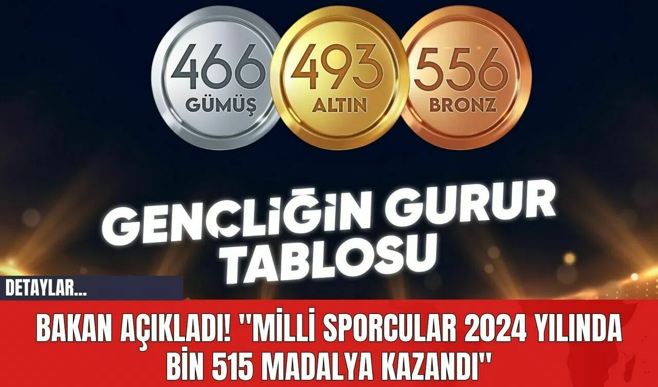 Gençlik ve Spor Bakanı Osman Aşkın Bak, sosyal medya hesabından yaptığı açıklamada, Türkiye'nin 2024 yılında uluslararası müsabakalarda bin 515 madalya kazandığını duyurdu. Bakan Bak, bu madalyaların 493'ünün altın, 466'sının gümüş ve 556'sının bronz olduğunu belirtti.