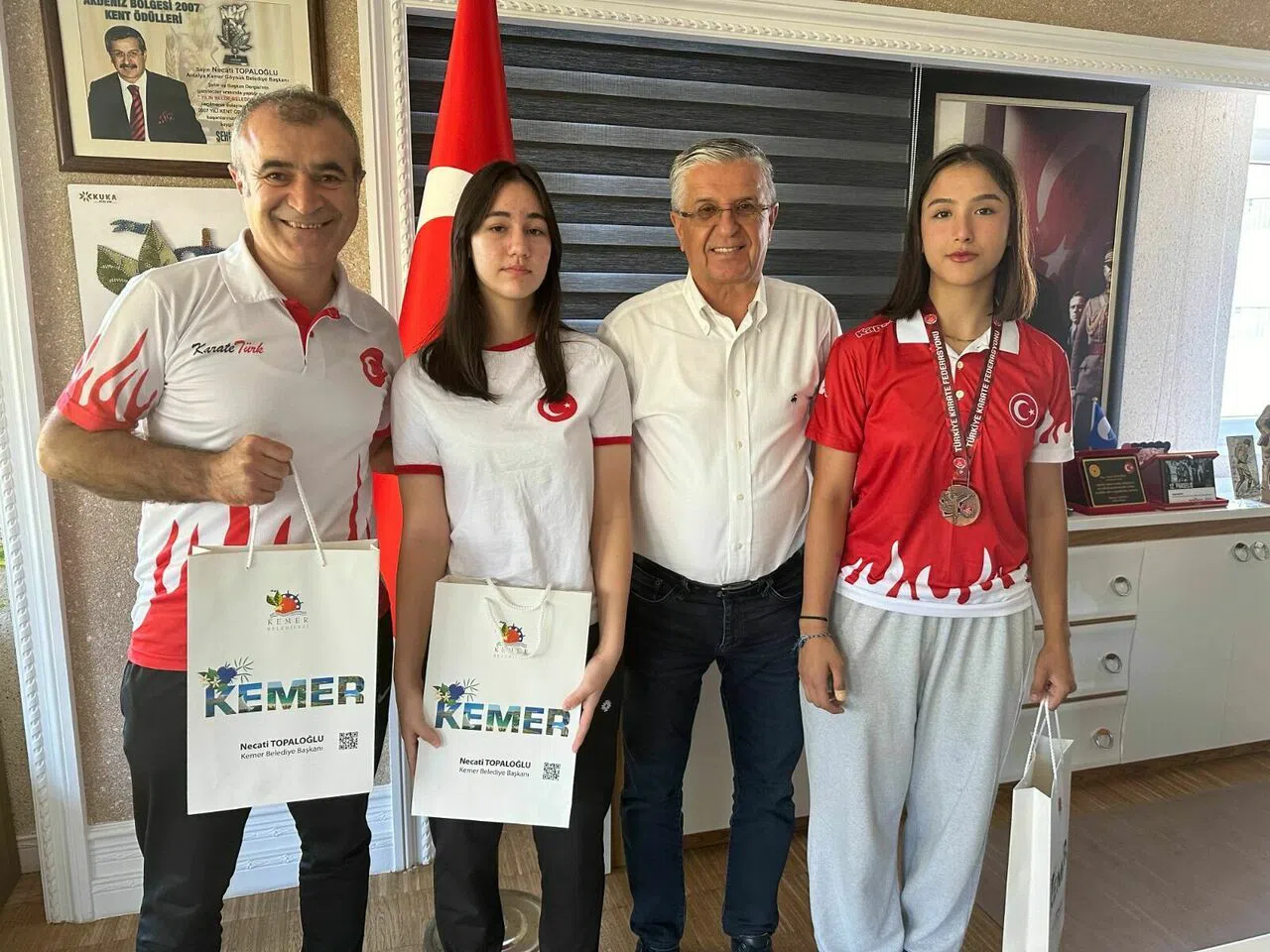 Kemer Belediyesi Karate Antrenörü Emin Akar, milli takım seçmelerinde dereceye giren Kemer Belediyesi Karate takımı sporcularıyla Kemer Belediye Başkanı Necati Topaloğlu’nu makamında ziyaret etti.