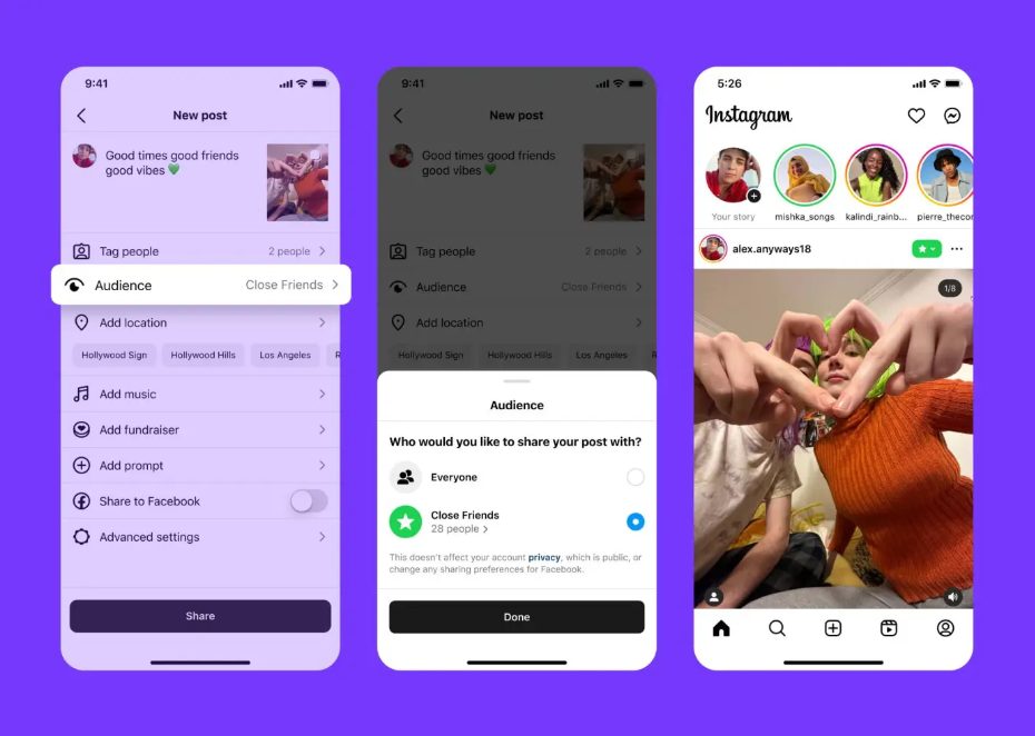2018 yılında kullanıma sunulan Instagram’ın ‘yakın arkadaşlar’ özelliği, kullanıcıların belirli bir grupla daha özel içerikler paylaşmasına olanak sağlıyor. Bu, kullanıcıların herkesin görmesini istemediği belirli gönderileri paylaşabilmesi için büyük bir adım oldu. Ancak, bu özellik, kullanıcıların gönderilerinde gizliliği ayarlamalarına izin vermiyordu; bunun yerine, kullanıcıların profilini gizlemesi gerekiyordu.