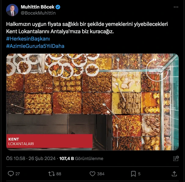 31 Mart 2024 yerel seçimlerinden önce Antalya Büyükşehir Belediyesi (ABB) mevcut başkanı Muhittin Böcek ve ABB başkan adayı ve Kepez Belediyesi eski başkanı olan Hakan Tütüncü Antalyalılara kent lokantası vaat etmişti. 26 Şubat 2024 tarihinde yerel seçimlerde başkanlık için yarışan Muhittin Böcek resmi sosyal medya hesabından ¨Halkımızın uygun fiyata sağlıklı bir şekilde yemeklerini yiyebilecekleri Kent Lokantalarını Antalya'mıza biz kuracağız¨ şeklindeki paylaşımıyla Antalyalılara kent lokantası kurma vaadi vermişti. Antalyalılar, Antalya’daki mevcut başkanlığını elinde tutmayı başaran Böcek, seçim vaadi olan Antalya Kent Lokantası’nı ne zaman açacağını sorularını yanıtsız bıraktı.
