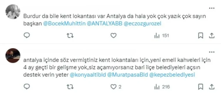 Antalya Büyükşehir Belediye Başkanı Muhittin Böcek’in yerel seçimlerden önce resmi sosyal medya hesabında ¨Halkımızın uygun fiyata sağlıklı bir şekilde yemeklerini yiyebilecekleri Kent Lokantalarını Antalya'mıza biz kuracağız¨ şeklindeki paylaşımın ardından Antalya’da hala bir kent lokantasının açılmaması soru işaretlerini beraberinde getirdi. İstanbul’da yurttaş 4 kap yemeği 40 Lira’ya yerken, Antalya Kent Lokantası’na kavuşacağı günleri bekliyor.