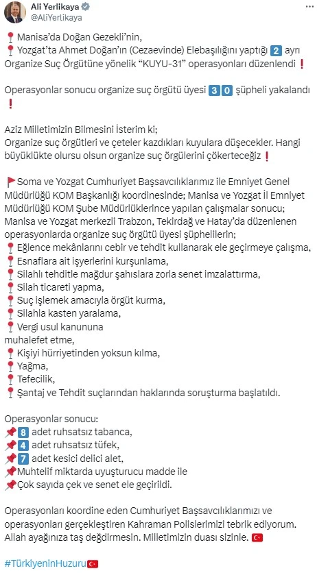 İçişleri Bakanlığı'nın yürüttüğü kapsamlı çalışmalar sonucunda, Manisa ve Yozgat'ta organize suç örgütlerine yönelik “Kuyu-31” operasyonları düzenlendi. İçişleri Bakanı Ali Yerlikaya'nın yaptığı açıklamaya göre, operasyonlar Manisa ve Yozgat merkezli olarak Trabzon, Tekirdağ ve Hatay'da gerçekleştirildi. Bu operasyonlarda, 30 şüpheli yakalanarak gözaltına alındı.