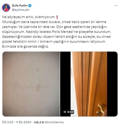 Evinin girişindeki duvara cinsel taciz mesajı yazılan Şule Aydın, olaya tepkisini X hesabından şu sözlerle ifade etti: “Ne söyleyeyim artık, bilemiyorum! Oturduğum daire kapısındaki duvara, cinsel taciz içeren bir kelime yazmışlar. Ve üzerinde bir leke var. Dün gece saatlerinde yapıldığını düşünüyorum. Kadıköy İskelesi Polis Merkezi’ne şikayette bulundum. Gazeteciliğimizden dolayı düzenli tehdit aldığım bu süreçte, bu cinsel şiddet tehdidini kimin / kimlerin yaptığının bulunmasını istiyorum. Evimizde bile güvende değiliz.”