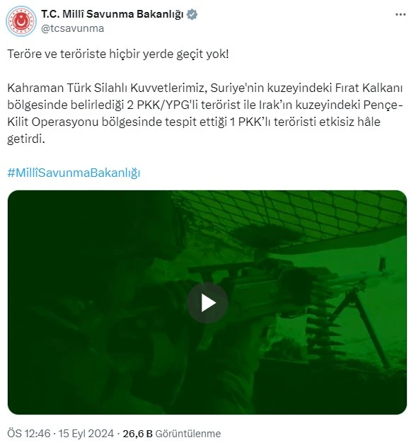 "Kahraman Türk Silahlı Kuvvetlerimiz, Suriye'nin kuzeyindeki Fırat Kalkanı bölgesinde belirlediği 2 P*K/Y*G'li ter*rist ile Irak'ın kuzeyindeki Pençe-Kilit Operasyonu bölgesinde tespit ettiği bir P*K'lı ter*risti etkisiz hale getirdi."