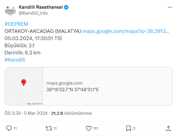 Kandilli Rasathanesi açıkladı. Malatya'nın Ortaköy-Akçadağ ilçelerinde 3.1 büyüklüğünde bir deprem meydana geldi. Depremin derinliği ise 6.3 km olarak kaydedildi.