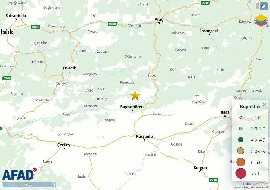 AFAD'dan yapılan açıklamada, Çankırı'nın Bayramören ilçesinde 3,5 büyüklüğünde deprem meydana geldiği bildirildi. Saat 11:53'da meydana gelen depremin derinliği ise 10.54 kilometre.